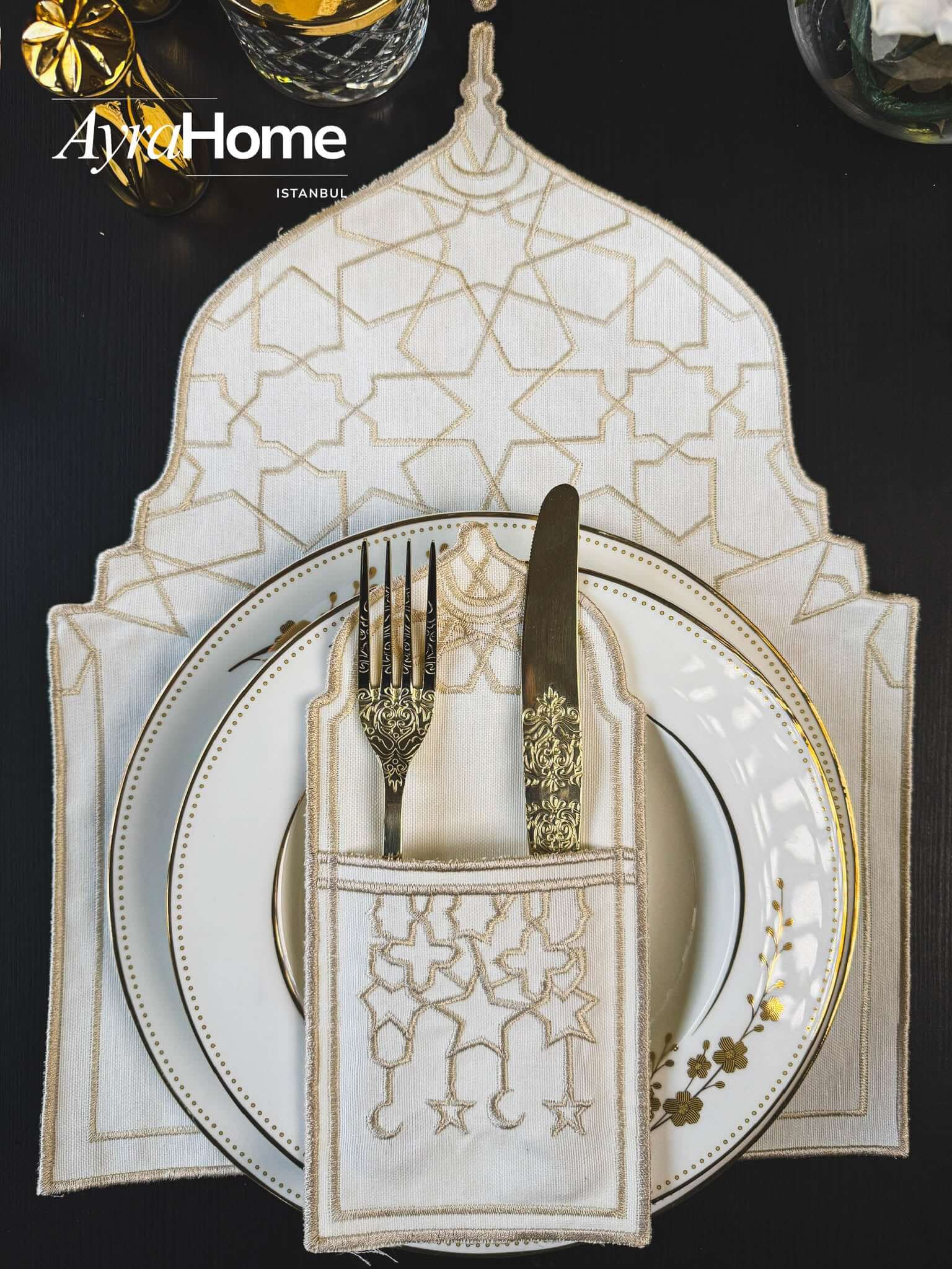 طقم مفارش سفرة - تصميم رمضان كريم - تطريز ذهبى - قماش كتان فاخر - ٦ أشخاص - ١٩ قطعة