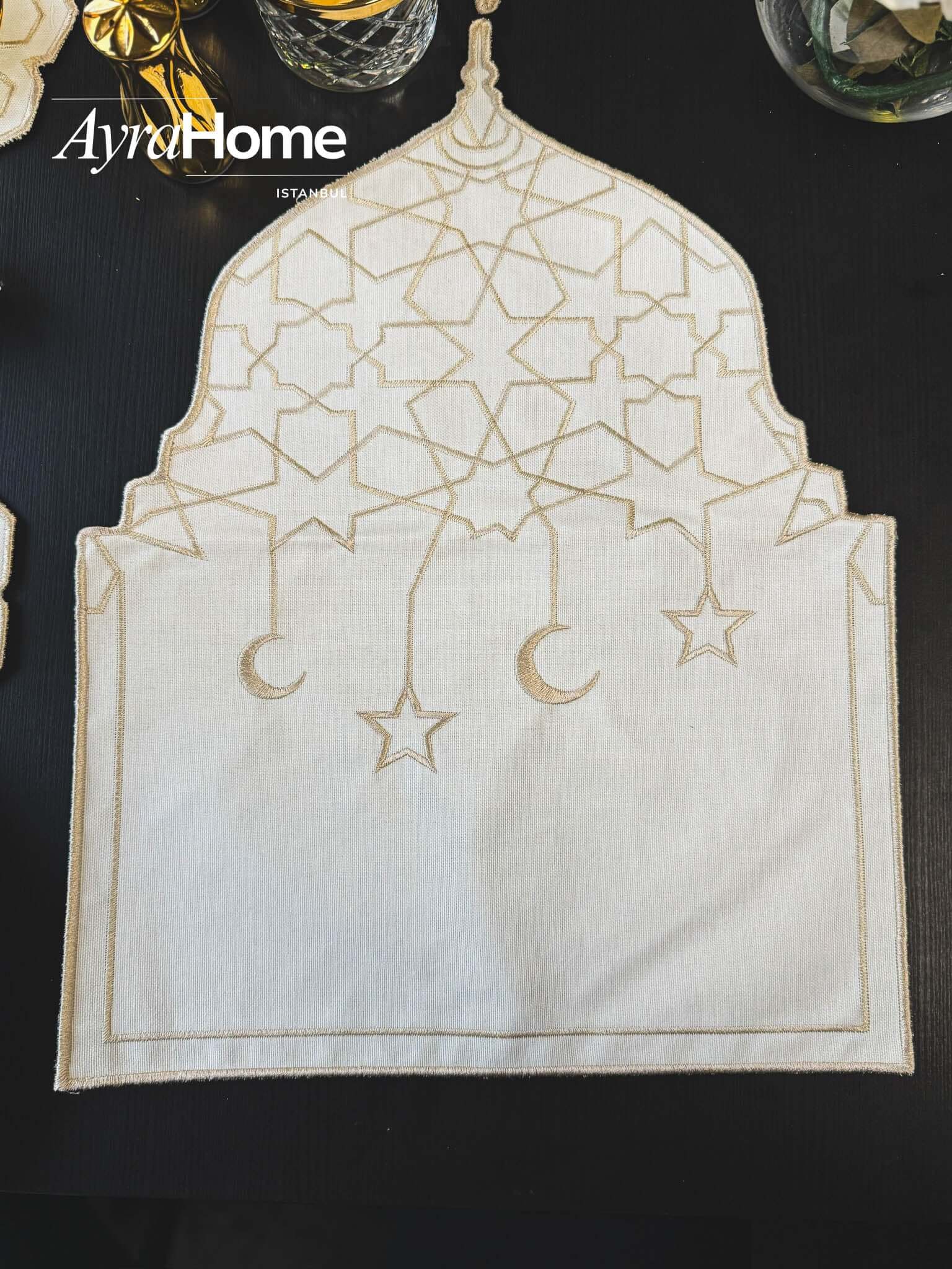 طقم مفارش سفرة - تصميم قبة رمضان - تطريز كابتشينو - قماش كتان فاخر - ٦ أشخاص - ١٩ قطعة